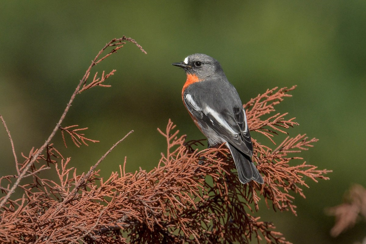 We were out following up on some sightings of Black-shouldered Kites and had been talking about how soon before the Flames would be around. As we crossed a fence-line and came toward the next gate, EE exclaimed, “A Flame Robin on the gate.” And, lo and behold, there was a brilliant red flash in the sunshine out in the open on the top of the gate. We followed him down the fence line as he hunted and eventually he disappeared. I guess when he’d flown about 200km or more to get here, 500m down the fence-line is nothing.