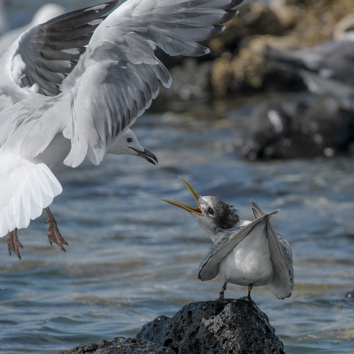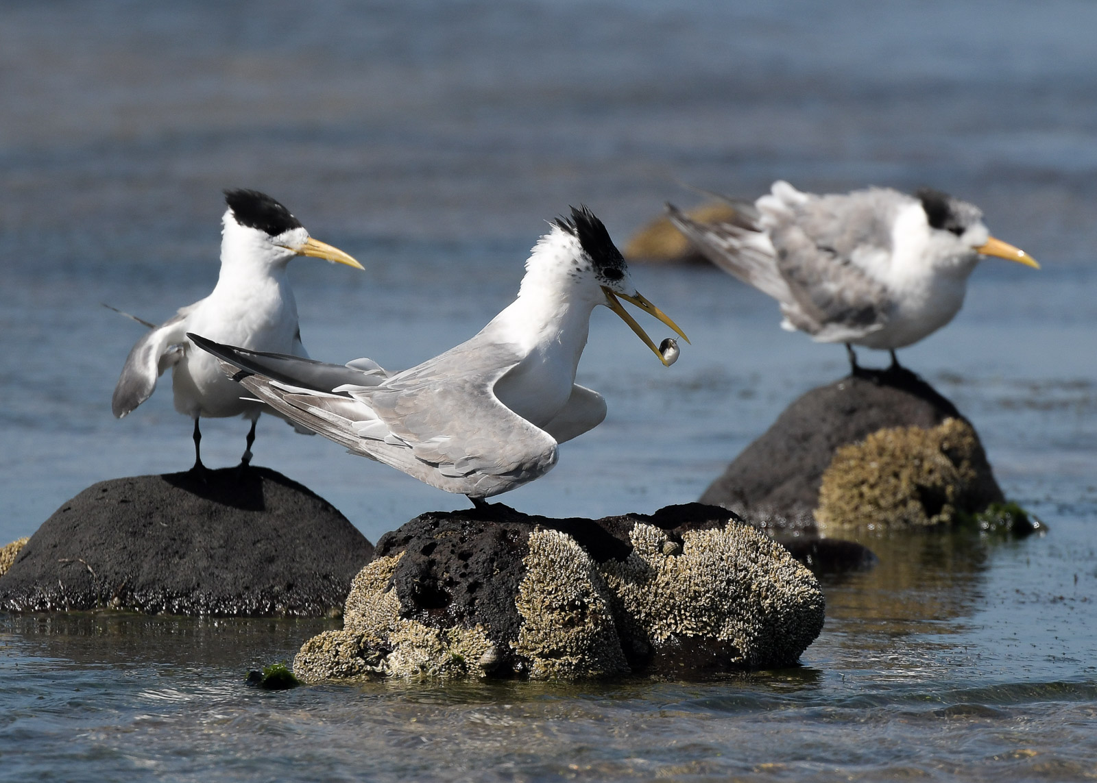 A tern came in with its latest catch and seemed to want to brag to everyone about its good fortune, and flew about from rock to rock cackling and playing with the meal.