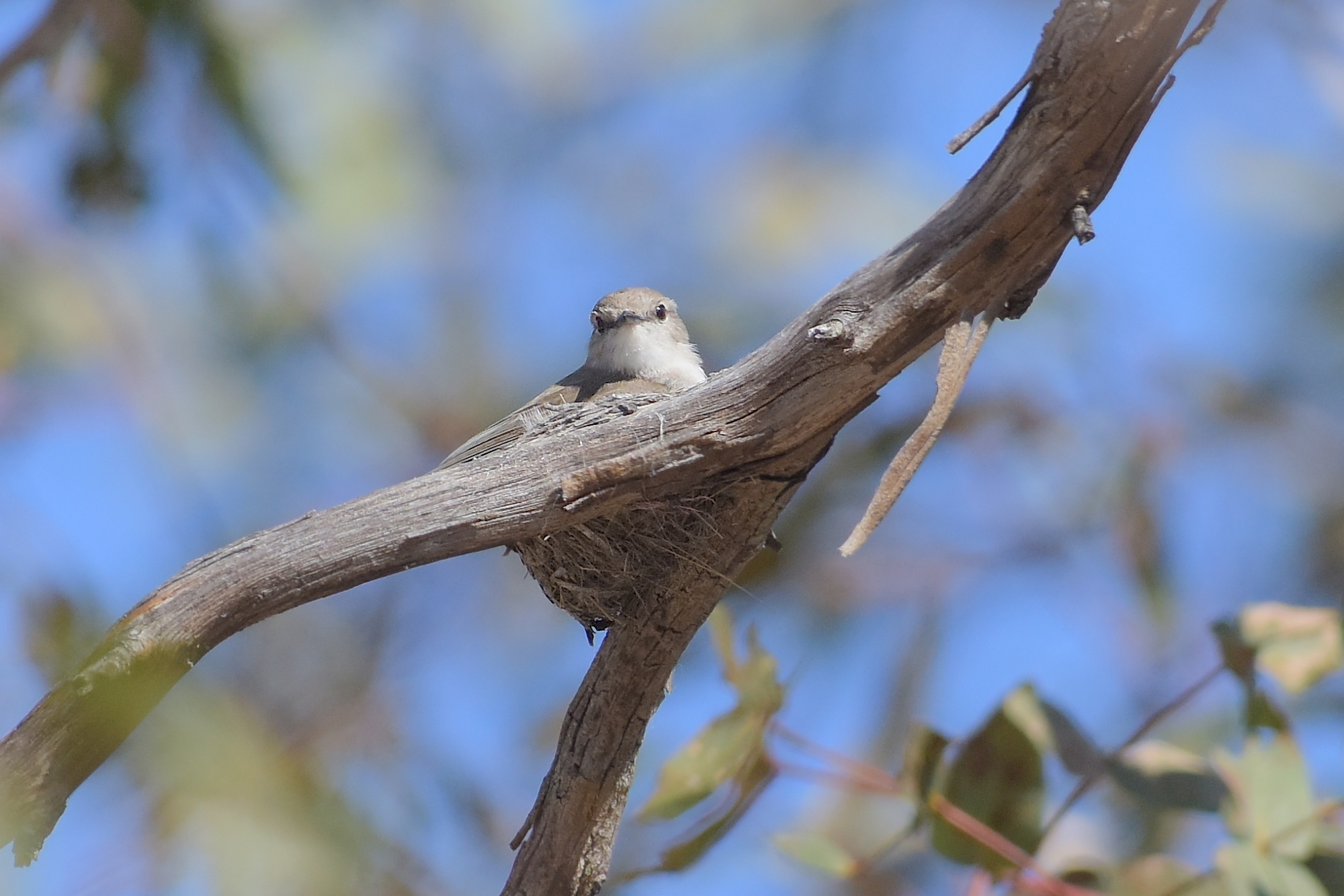 So we stopped and eventually I reckoned it about 500mm further down so we went to look. No doubt about it, a Jacky Winter, and quite vocal, and very busy. The EE spotted a pattern of flying into one tree, and a few minutes later announced, like some magician about to pull a rabbit from a hat. “Look, she is building a nest!”.
