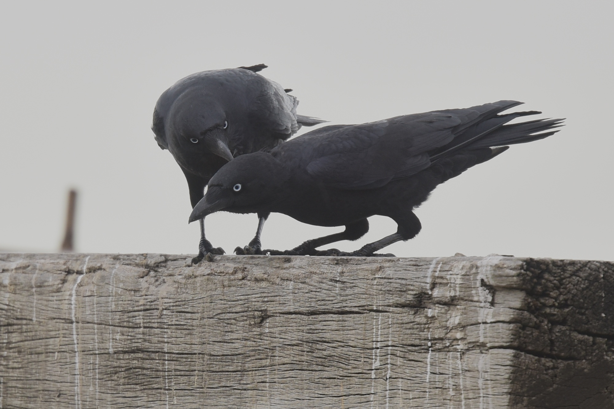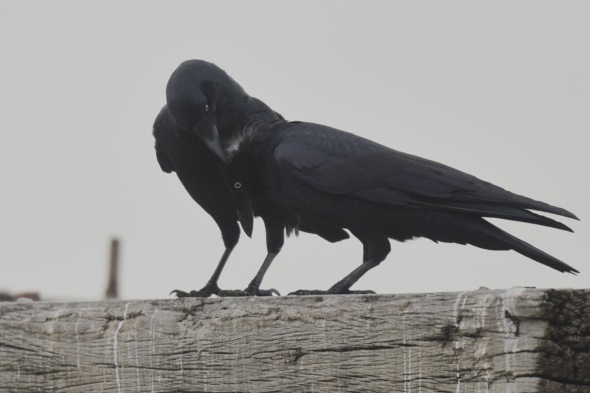 Both flew to the top of the old jetty. And after a bit more discussion, the smaller of the two moved closer to the other, put its head down and. The larger bird began to alopreen it.