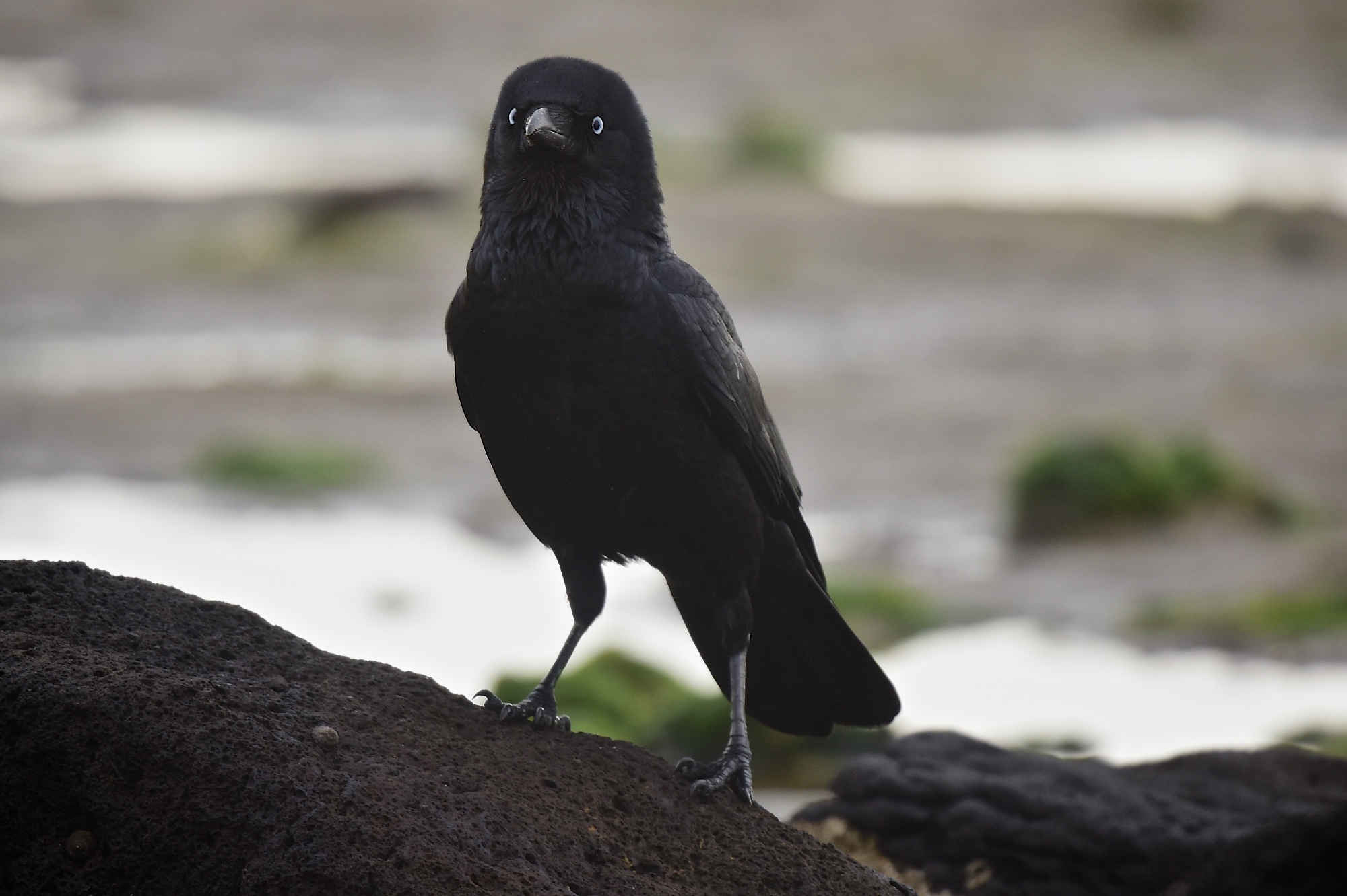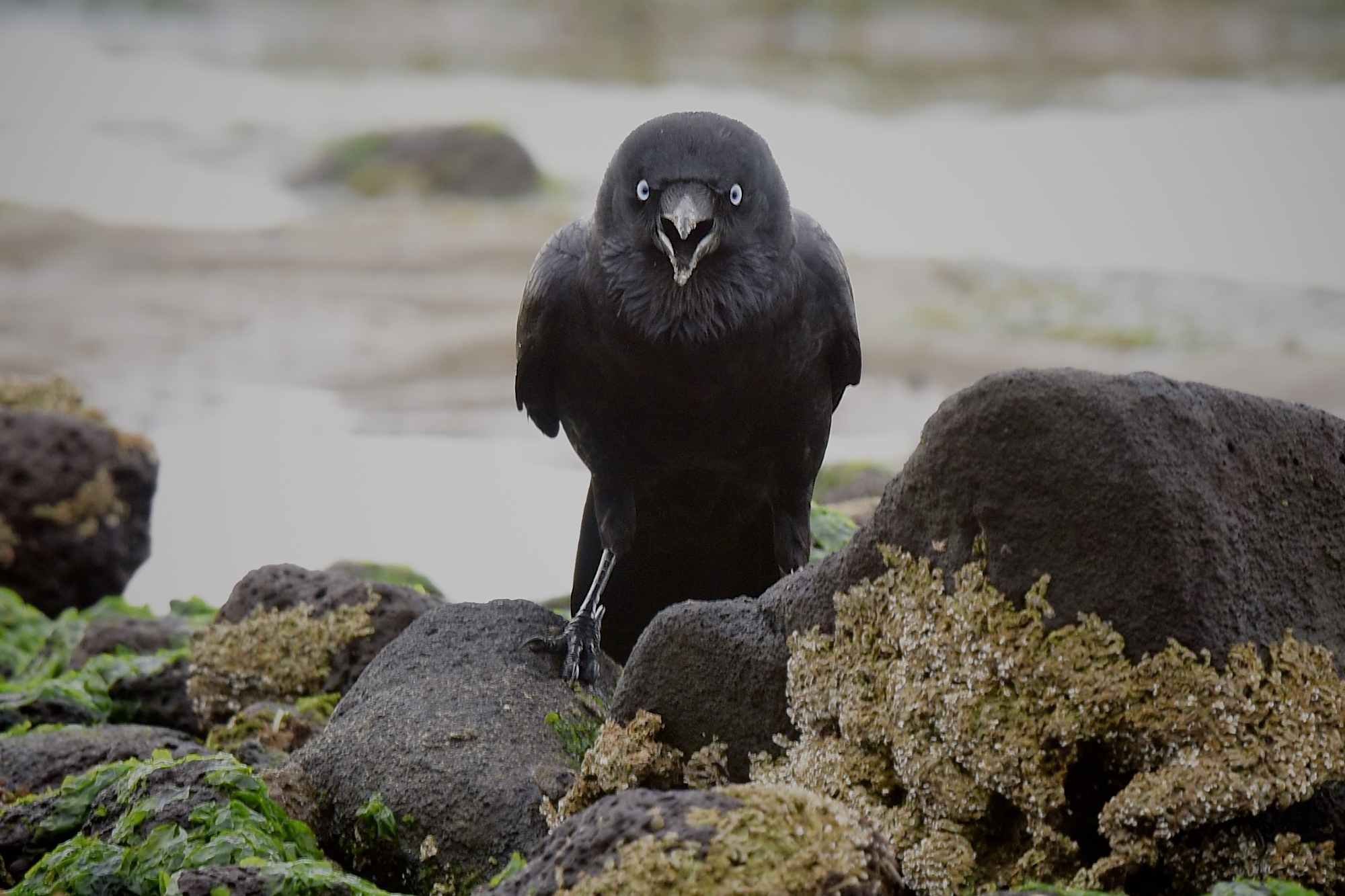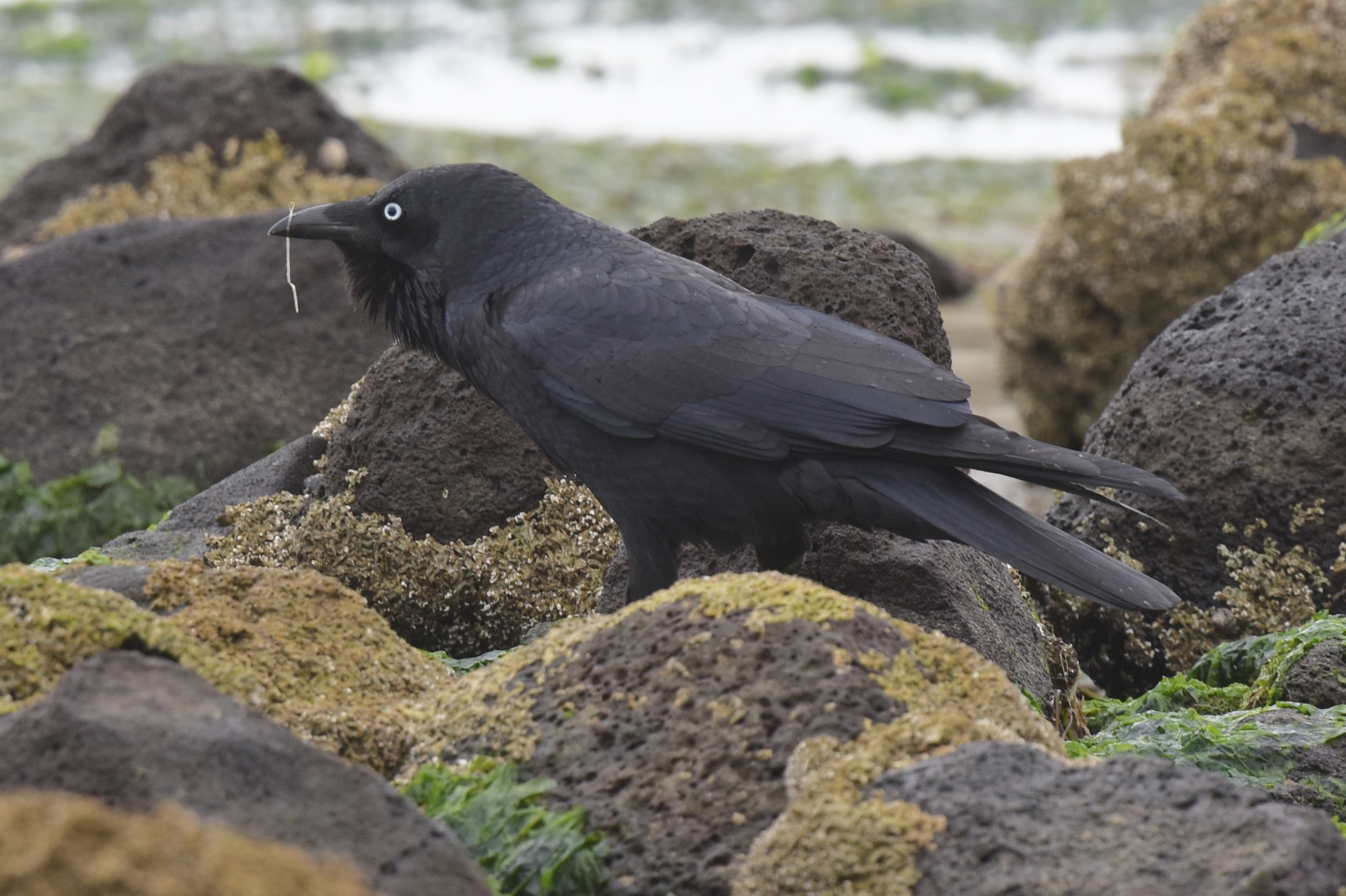 Cahhh Cahhhw Cawww, from along the beach. A Little Raven was working among the exposed rocks and intent on telling somebody what was going on. Into the second cuppa and the bird had worked right up to where we were sitting. Then began the usual, is it a Little or an Australian Raven?