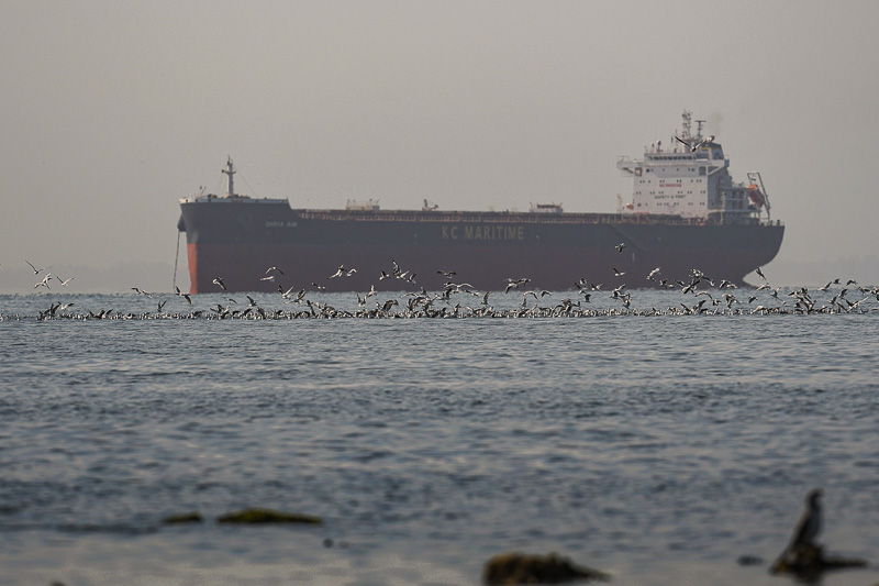 We ventured to the beach area. Low tide here, and most of the birds are well out beyond the end of the rock platform.